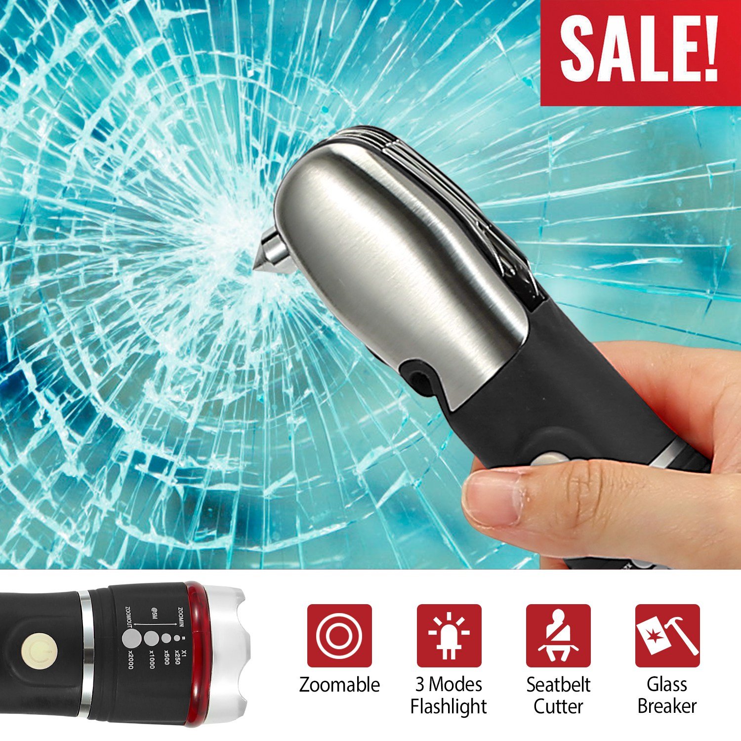 8-IN-1 MULTI-TOOL: This convenient tool combines 8 essential functions in one device. It includes an 80lm zoomable LED flashlight, a sturdy hammer, a seat belt cutter, a sharp knife blade, a precision screwdriver, scissors, a bottle opener, and a nut wrench. These multi-tools make it easier to access everything you need during emergencies.